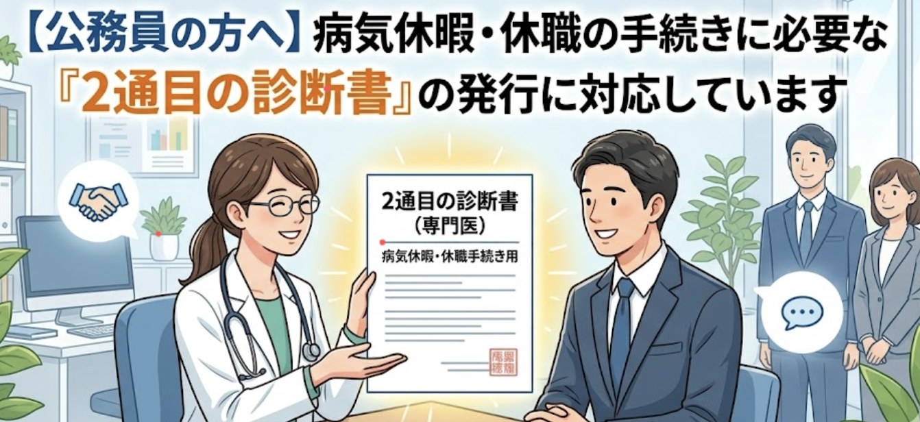 名古屋市千種区の今池メンタルクリニックでは、公務員特有の休職・復職制度に配慮し、こうした「2通目の診断書(セカンドオピニオンとしての診断書)」の発行に迅速に対応しております。