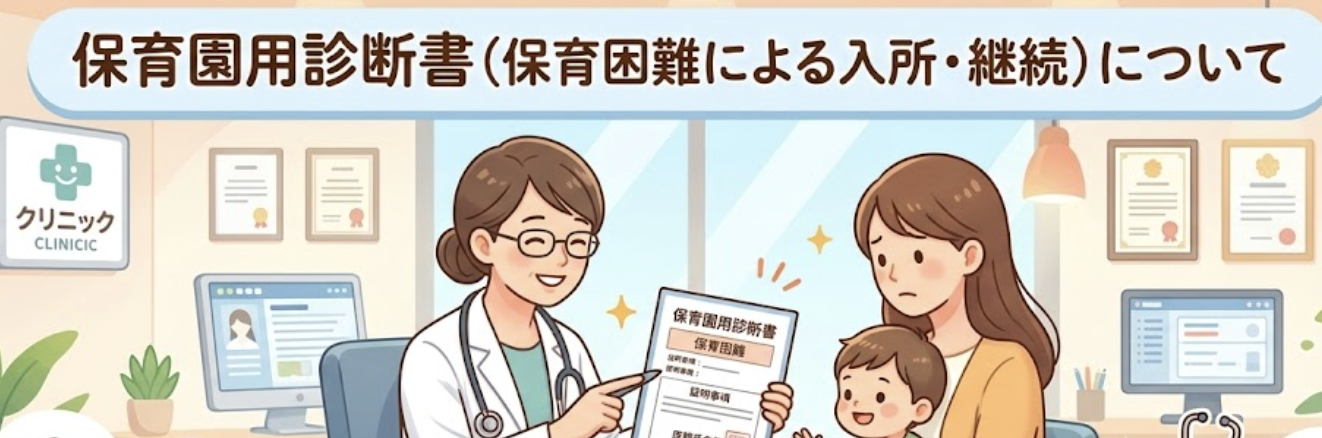 診察の結果、治療や休養が必要であり、ご家庭での保育が困難であると判断された場合に診断書を作成いたします。症状が明確な場合は初診時の即日発行も可能ですが、正確な診断のために何度か通院いただいた後の発行となるケースもございます。