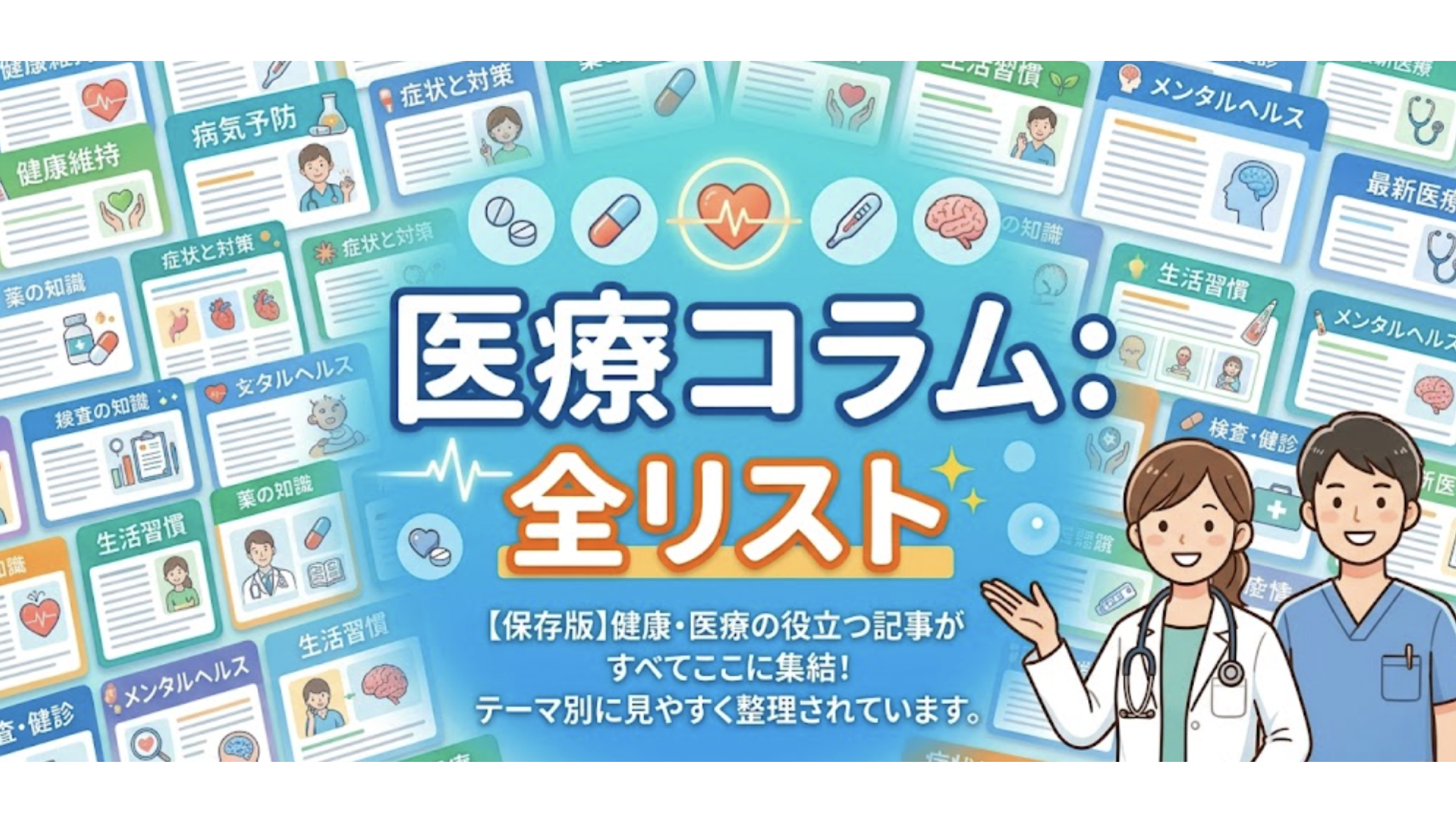 医療コラム:全リスト 2026 4/13 医療コラム 2026年4月13日 【疾患】うつ病適応障害パニック障害不眠症躁うつ病(双極性障害)注意欠陥多動性障害(ADHD)社交不安症全般性不安障害統合失調症強迫性障害【症状】眠れない頭が回らない喉の詰まり(つかえ感)動悸意欲が湧かないなにもしたくない息苦しい 【治療薬】抗うつ薬抗不安薬睡眠薬気分安定薬抗精神病薬ADHD治療薬漢方対症療法薬その他【公的支援制度】自立支援医療制度精神障害者福祉手帳障害年金傷病手当金【文書】休職診断書猟銃診断書公務員の2通目診断書保育園用診断書受診状況等証明書 【産業医学】産業医健康診断の事後措置 休職・復職の判定支援 高ストレス者面談 長時間労働者面談 衛生委員会メンタルヘルス不調対応 医療コラム 衛生講話:全リスト